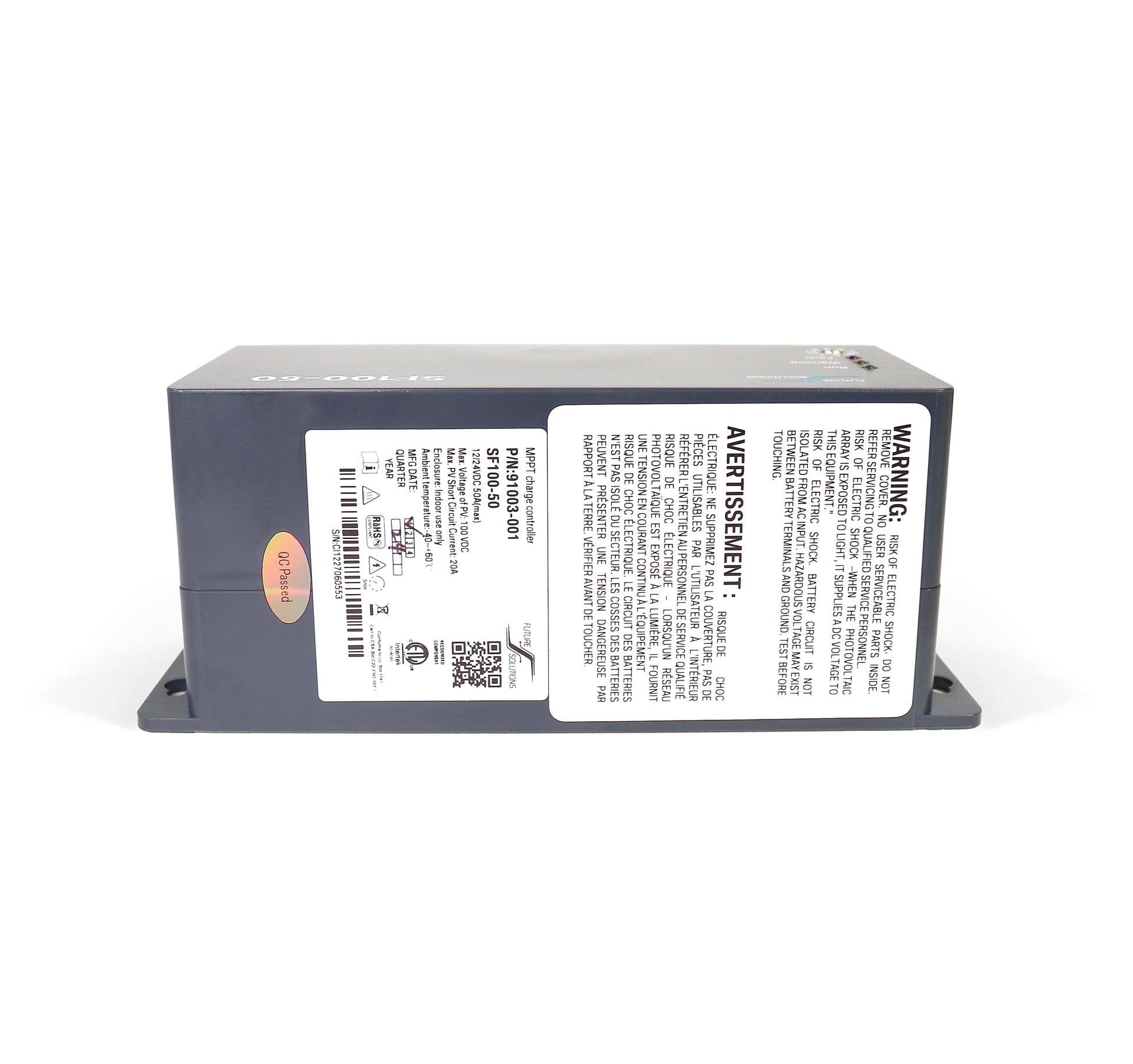 Future Solution's SF100-50 is a 100 volt 50 amp solar charge controller that utilizes advanced MPPT technology which enables the controller to quickly identify the maximum power point of a solar array, ensuring real-time energy capture and maximum current charging for your battery.