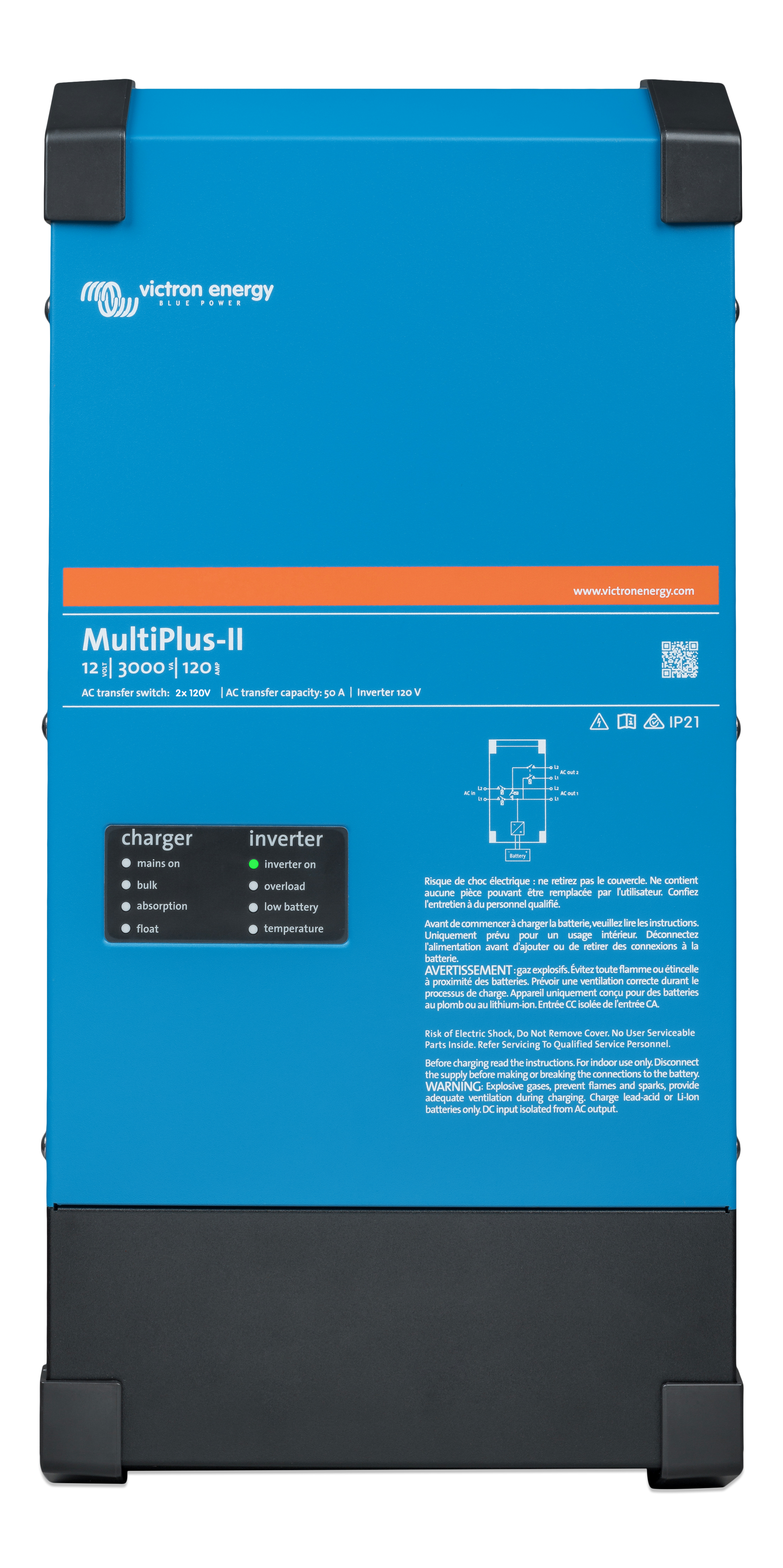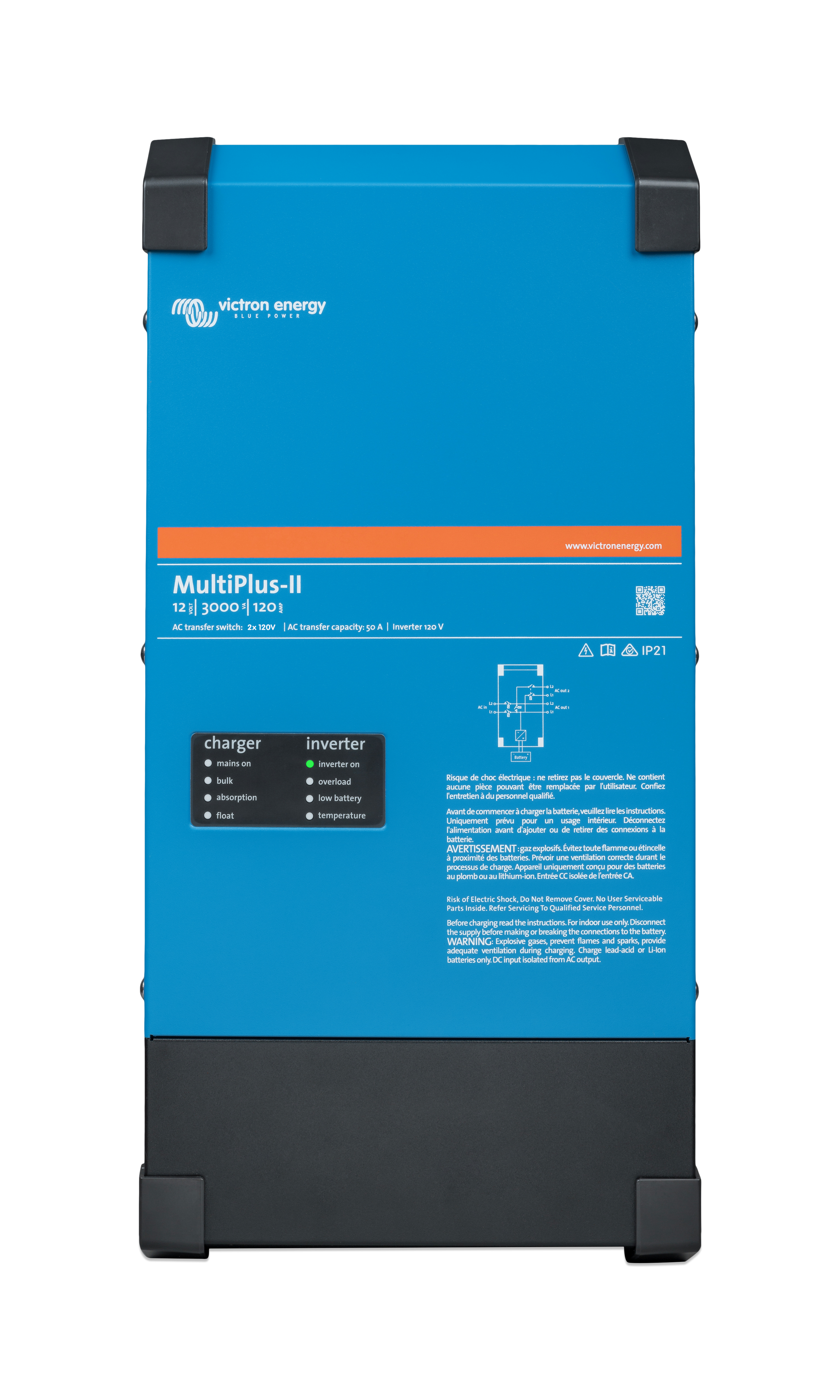 The MultiPlus-II 2x 120V inverter/charger unit includes all the key features of our flexible inverter/charger series. It has PowerControl and PowerAssist functionality, allows you to set an input current limit, and provides two AC output connections. This model can also be configured in parallel or 3-phase setups to achieve higher capacity VE.Bus systems. The MultiPlus-II 2x 120V is compatible with LiFePO4 batteries as well as several other battery types.